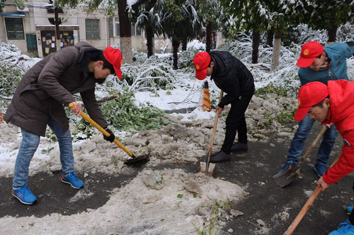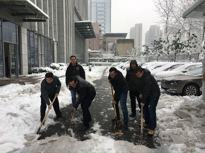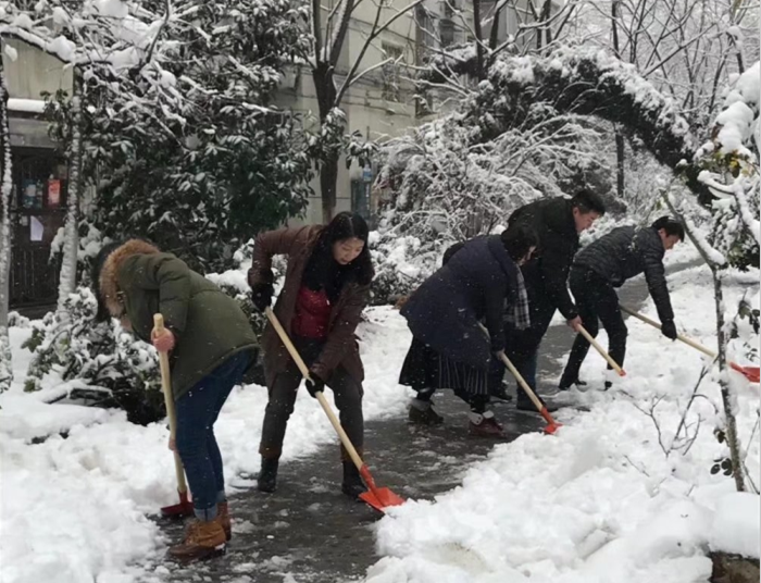 从4日开始,后勤集团及时启动扫雪铲冰应急预案,各中心职工及物业人员到岗就位,携带铁锨、竹竿等工具,冒着风雪,对路面积雪进行反复清扫。校园部分树木因大雪积压发生折断,物业人员自4日起不间断地对断枝进行清理,双休日不休息。绿化工人不间断地打落树上积雪,缓解被积雪压断枝状况,对倒伏树木进行了加固,确保校园主要道路、办公区、教学区、家属区等重点公共场所树木没有积雪。