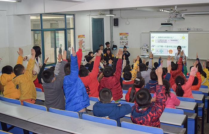 当天下午,学校“暖风”志愿者团队还开展了“宪法宣传进小学”活动。志愿者们通过普法动漫宣传片和法律小知识幻灯片的播放,以及有趣的互动游戏,让附属小学一年级的小朋友们学习了解了基础的宪法常识,让宪法精神的种子在孩子心中萌芽,活动现场氛围十分热烈。同时,“宪法进社区”活动也在三里庵街道开展起来,普法志愿者们通过问卷调查、发放宣传册等形式带动社区居民学习宪法。