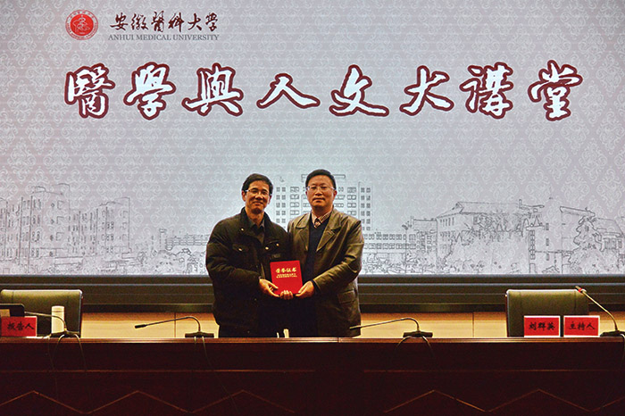12月10日下午,我校素质教育品牌栏目“医学与人文大讲堂”第57期开讲。安徽大学文学院院长、博士生导师吴怀东教授,应邀为我校师生作题为《杜甫的美学》的报告,校党委副书记刘群英主持报告会,并向吴怀东教授颁发了“医学与人文大讲堂”荣誉证书。副校长肖圣龙现场聆听了报告。