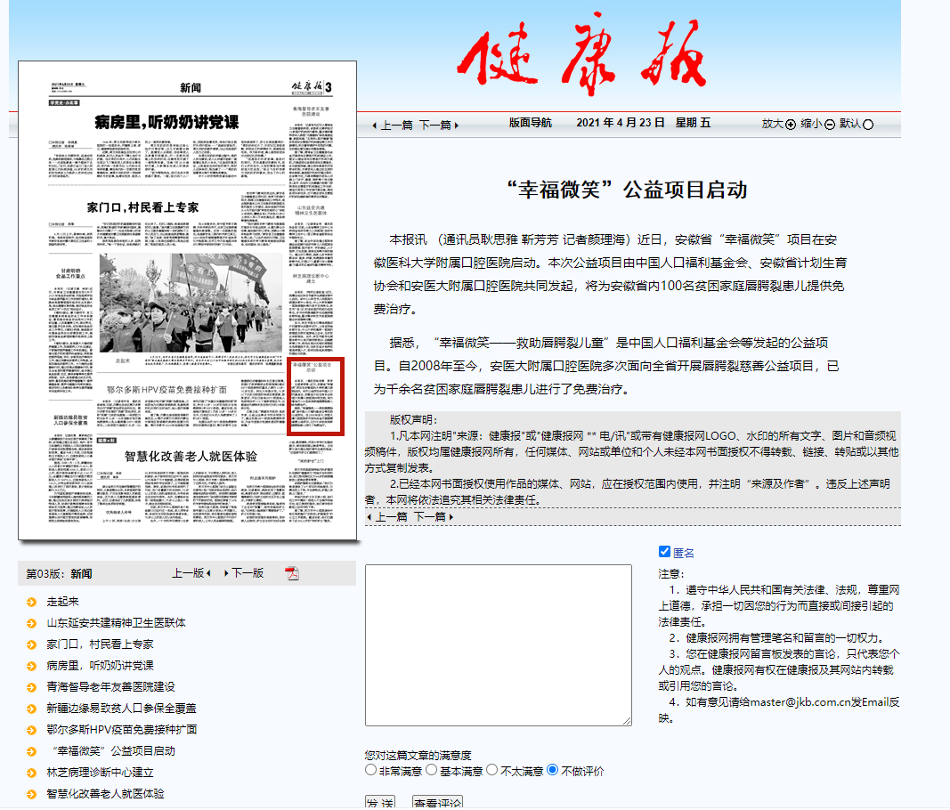 据悉,“幸福微笑——救助唇腭裂儿童”是中国人口福利基金会等发起的公益项目。自2008年至今,安医大附属口腔医院多次面向全省开展唇腭裂慈善公益项目,已为千余名贫困家庭唇腭裂患儿进行了免费治疗。