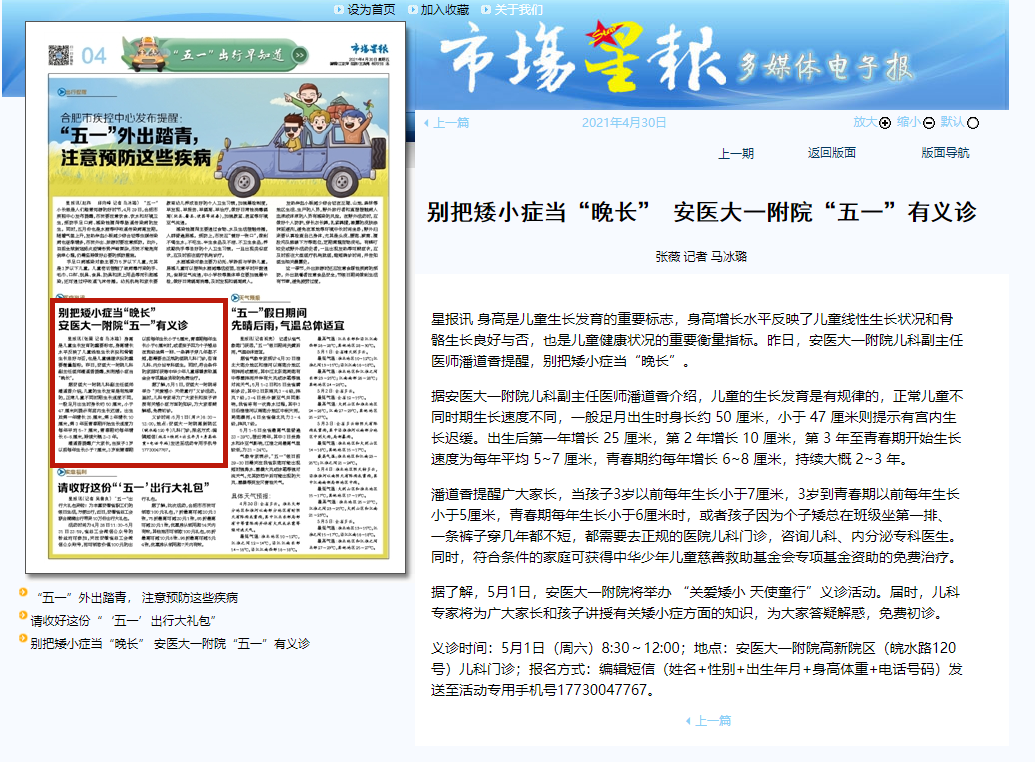 据了解,5月1日,安医大一附院将举办 “关爱矮小 天使童行”义诊活动。届时,儿科专家将为广大家长和孩子讲授有关矮小症方面的知识,为大家答疑解惑,免费初诊。