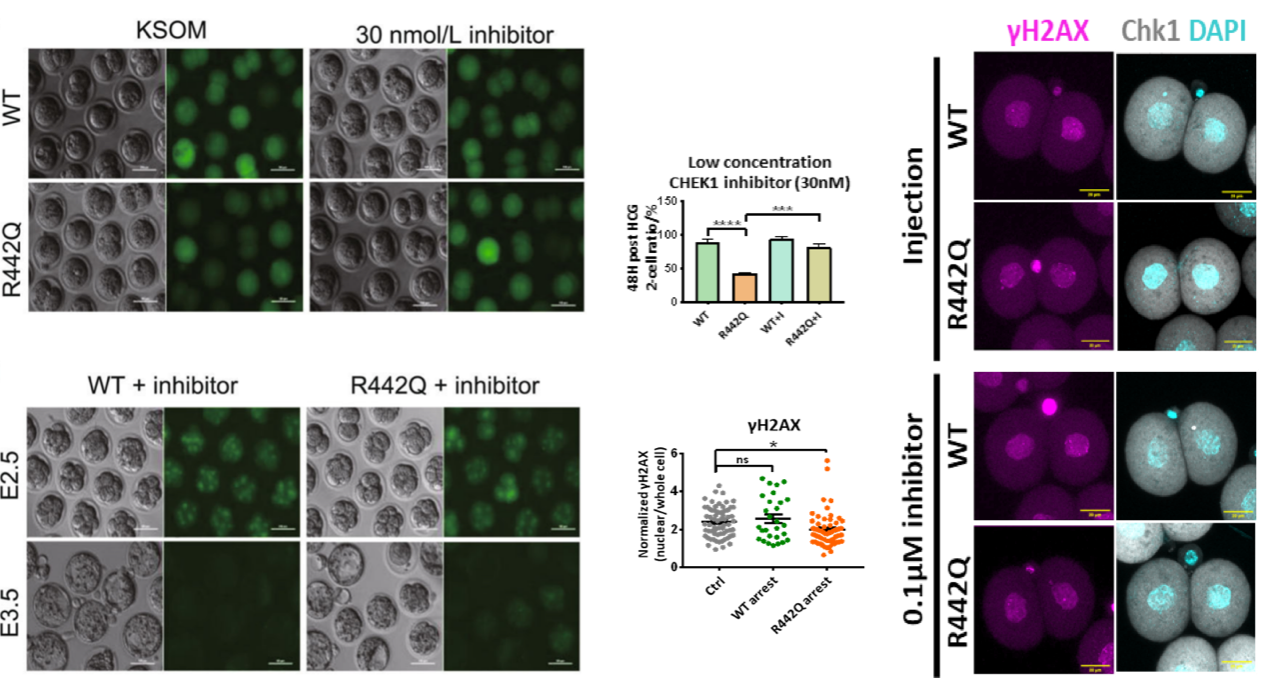 为了寻找此突变造成的不孕症的解决方案,他们进一步利用CHEK1的抑制剂处理引入突变Chk1蛋白的小鼠受精卵,经处理的受精卵进一步发育的比例大大提升,并可以在移植后出生健康的子代。研究表明,低剂量的CHEK1抑制剂处理没有造成更多DNA损伤,也并未造成显著的转录组改变。