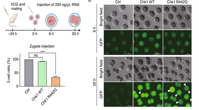 联合团队进一步研究发现,作为DNA损伤检查点激酶,当细胞中发生DNA损伤时,CHEK1激酶活化,阻止细胞周期向下进行并启动修复程序,直到DNA错误修复或细胞凋亡。研究人员克隆了对应的小鼠Chk1突变mRNA,并通过显微注射的手段将其引入小鼠受精卵,突变的Chk1蛋白造成半数以上小鼠受精卵第一次有丝分裂的阻滞。升高的CHEK1激酶活性使得第一个有丝分裂检查点阈值过高,在不存在DNA损伤或错误的情况下,细胞周期依然无法向下进行。