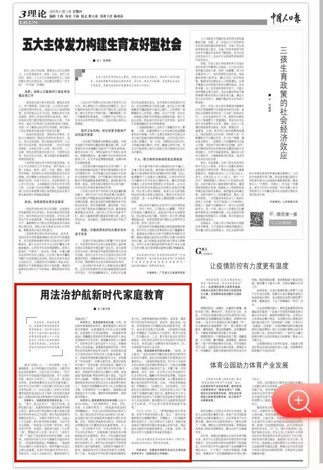 《礼记·大学》云:“所谓治国必先齐其家者,其家不可教而能教人者,无之。”良好的家庭教育是支撑国家富强、民族复兴、人民幸福梦想的首要柱石。历史和现实告诉我们,家庭的前途命运同国家和民族的前途命运紧密相连。要让法治为新时代家庭教育护航,让家庭、家风、家教成为筑牢民族复兴伟业的坚强基石。