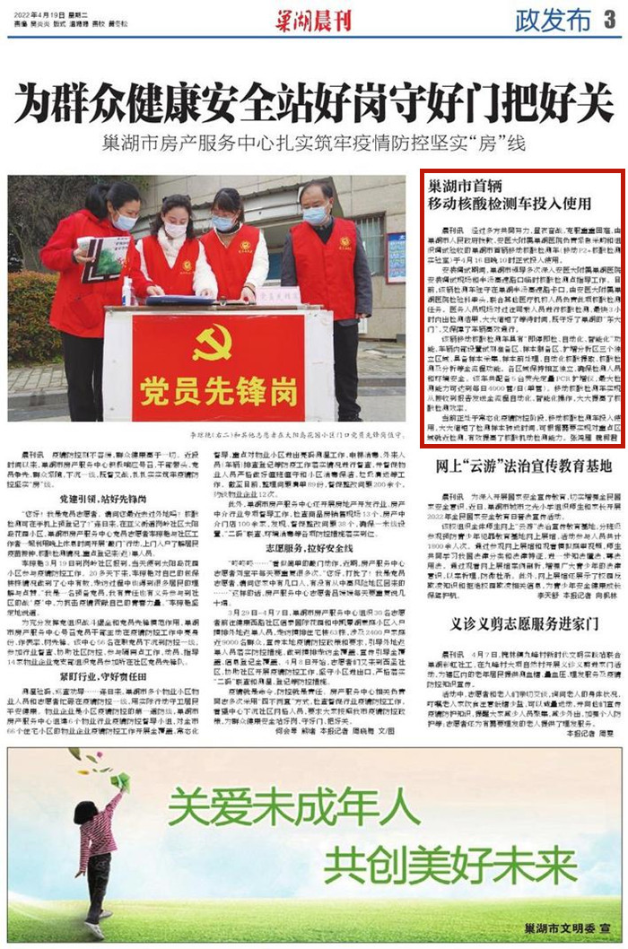 晨刊讯 经过多方共同努力,昼夜奋战,克服重重困难,由巢湖市人民政府拨款、安医大附属巢湖医院负责紧急采购和组织调试验收的巢湖市首辆移动核酸检测车(移动P2+核酸检测实验室)于4月16日晚10时正式投入使用。