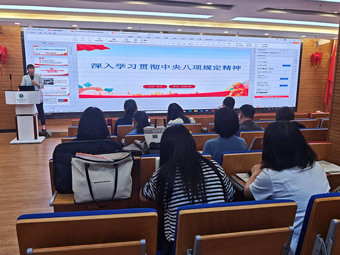 张芳以“深入学习贯彻中央八项规定精神”为题,为全体党员讲授专题党课。她解读了中央八项规定的具体内容,阐释了中央八项规定精神的核心要义与实践要求。她希望全体党员时刻保持清醒,深刻认识作风建设永远在路上,纠治“四风”特别是违规吃喝问题一刻不能松懈,要切实加强作风建设,严格落实学校相关举措,以更高标准、更严要求贯彻落实中央八项规定精神,确保中央八项规定精神内化于心、外化于行。